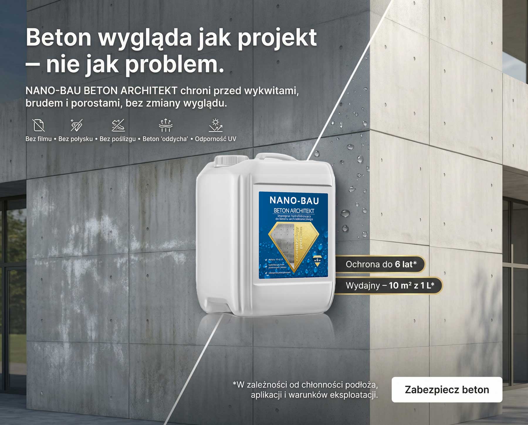 Nano-Bau BETON ARCHITEKT to kompleksowe rozwiązanie łączące innowacyjną nanotechnologię z ekologią, gwarantujące betonowi architektonicznemu długotrwałą ochronę i zachowanie jego strukturalnej oraz wizualnej integralności.