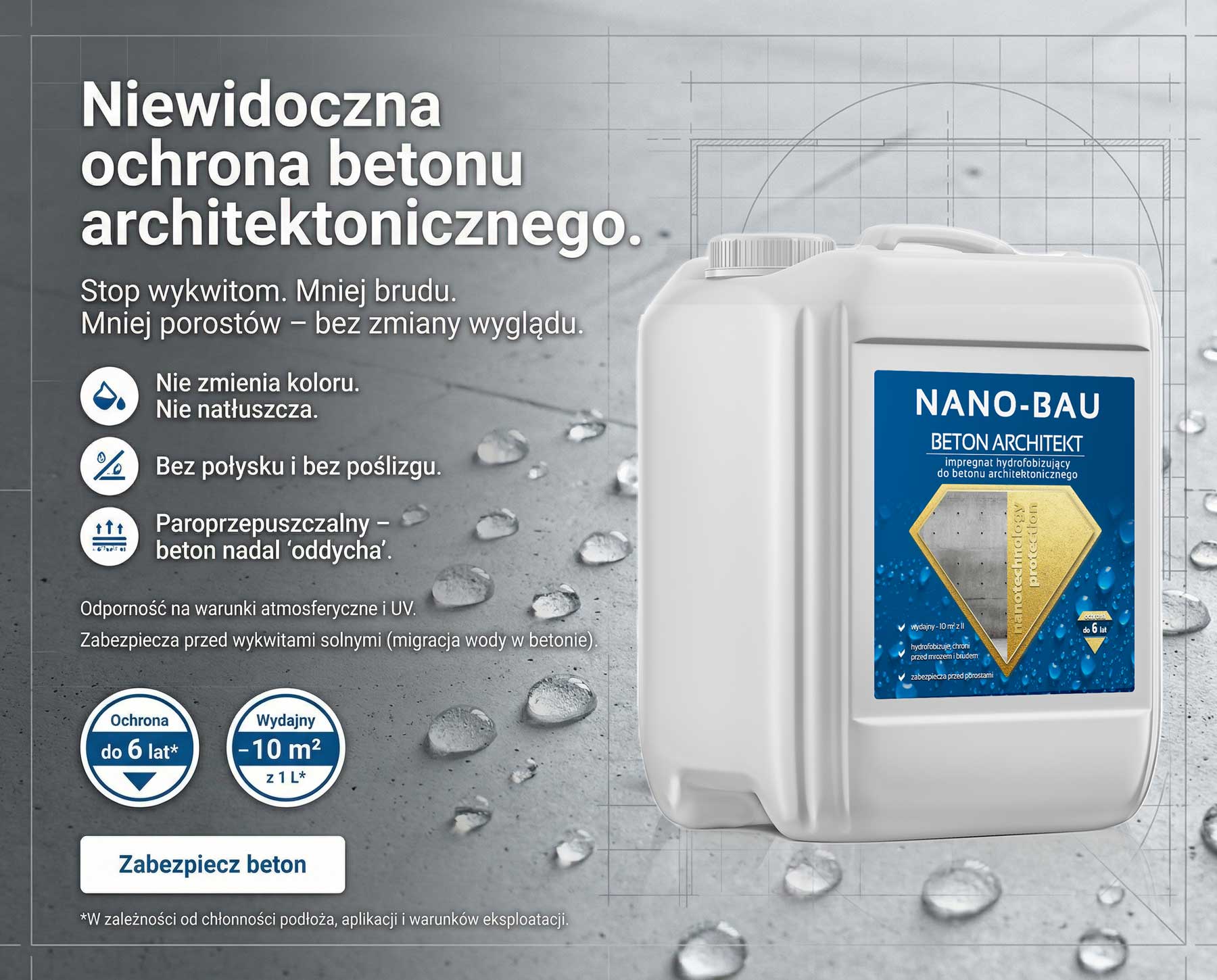 - Impregnat NANOBAU Beton Architekt wnika do kilku mm powierzchni betonu, tworząc hydrofobową barierę, która chroni materiał przed wilgocią i porostem mchów, alg i grzybów. Impregnacja utrzymuje beton w idealnym stanie nawet do 8 lat, co jest szczególnie ważne dla powierzchni eksploatowanych, takich jak parkingi czy garaże.