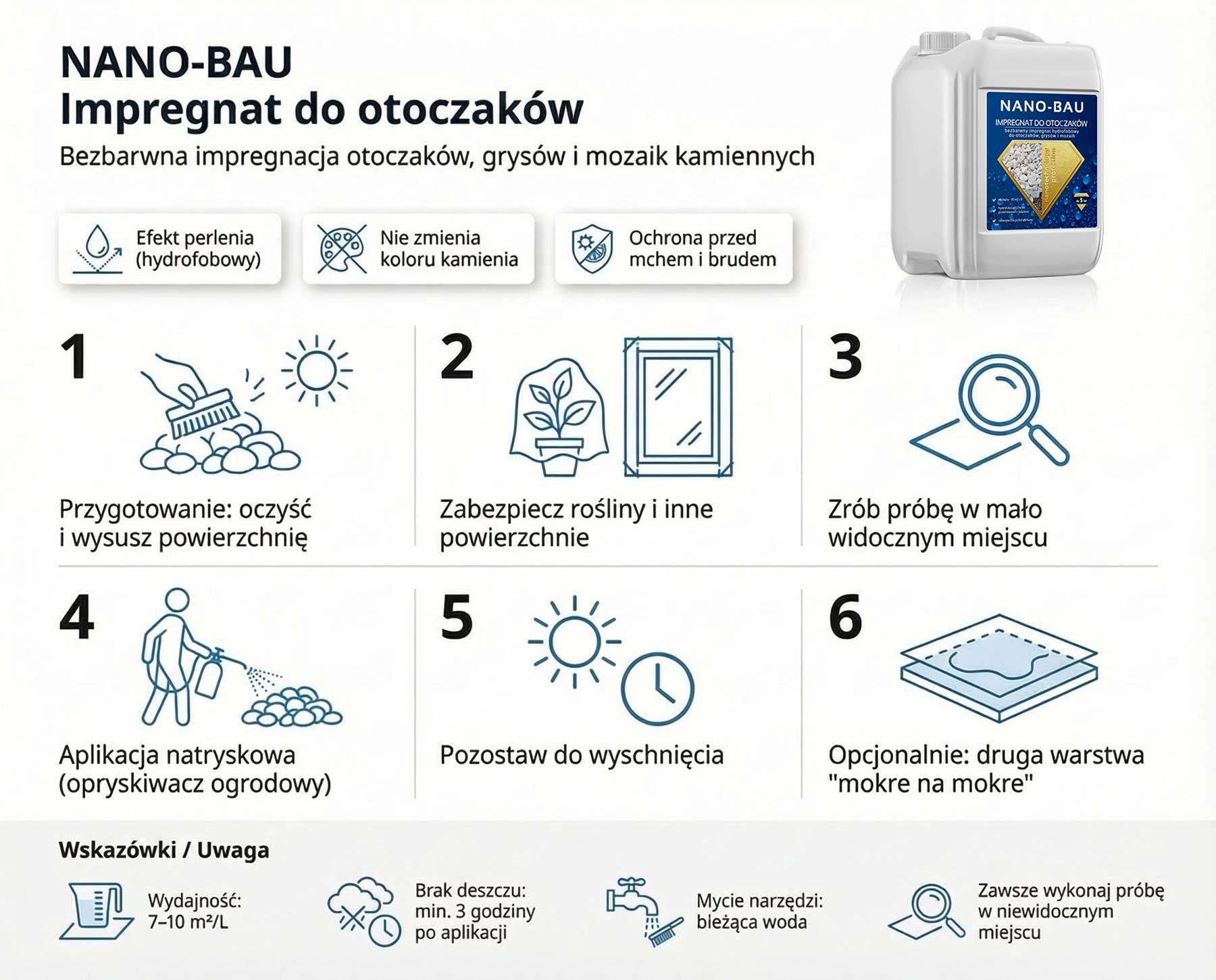 Proces zabezpieczania otoczaków impregnatem NANOBAU jest prosty i niezwykle skuteczny. Aby rozpocząć, należy upewnić się, że powierzchnia otoczaków jest czysta i sucha. Następnie należy równomiernie rozprowadzić impregnat na kamiennej powierzchni, można to zrobić za pomocą pędzla lub wałka. W przypadku większych obszarów opryskacz może być również skutecznym narzędziem.