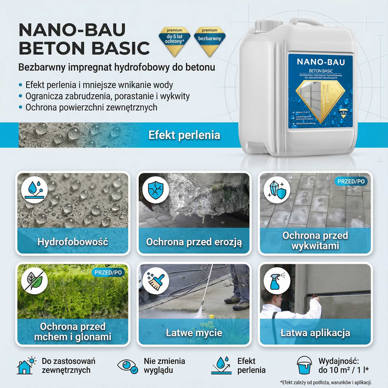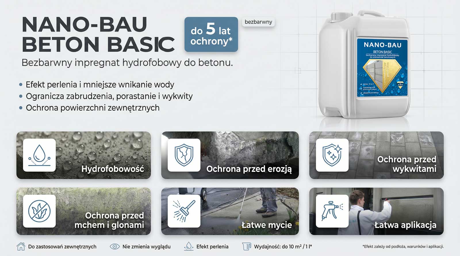 NANOBAU BETON BASIC preparat do impregnacji betonu to skuteczna ochrona przed wilgocią, zabrudzeniami i mrozem. Dzięki nanotechnologii głęboko penetruje beton, zwiększając jego odporność na ścieranie i czynniki chemiczne. Nie zmienia koloru powierzchni i zachowuje jej naturalny wygląd. Ekologiczny, bezpieczny i idealny do stosowania wewnątrz i na zewnątrz budynków.