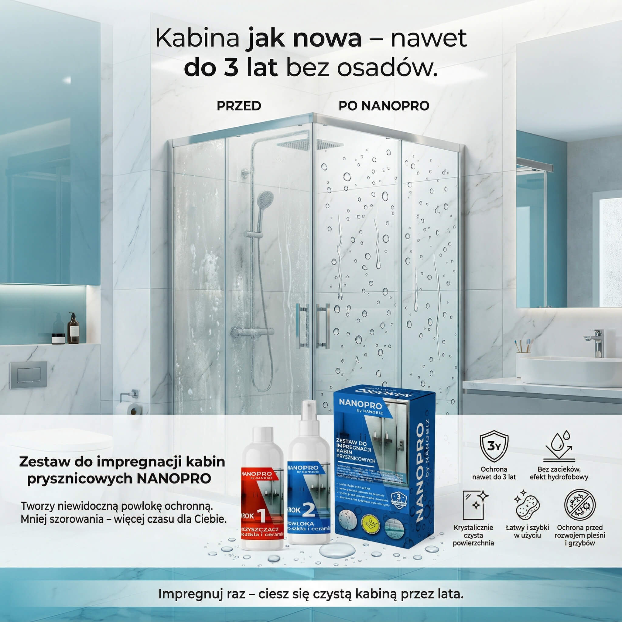 NANOPRO Impregnat do Kabin Prysznicowych to więcej niż zwykły środek czyszczący – to kompleksowe, innowacyjne rozwiązanie, które całkowicie zmienia podejście do pielęgnacji łazienki!