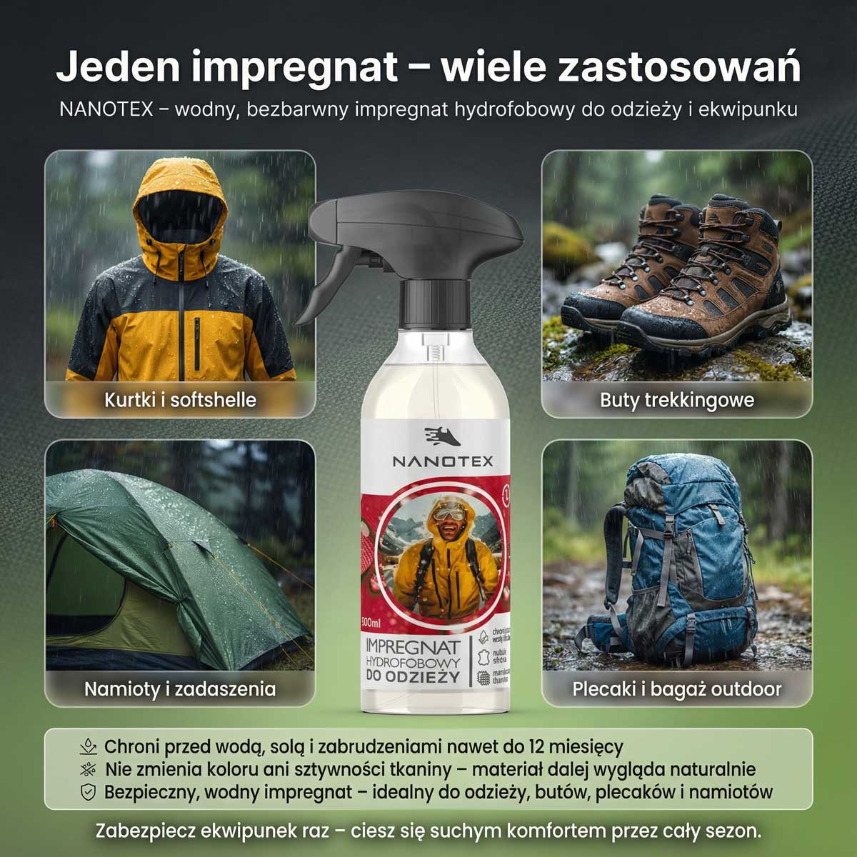 do kurtek, spodni, butów, plecaków – NanoTex Impregnat Wodoodporny do Ubrań,