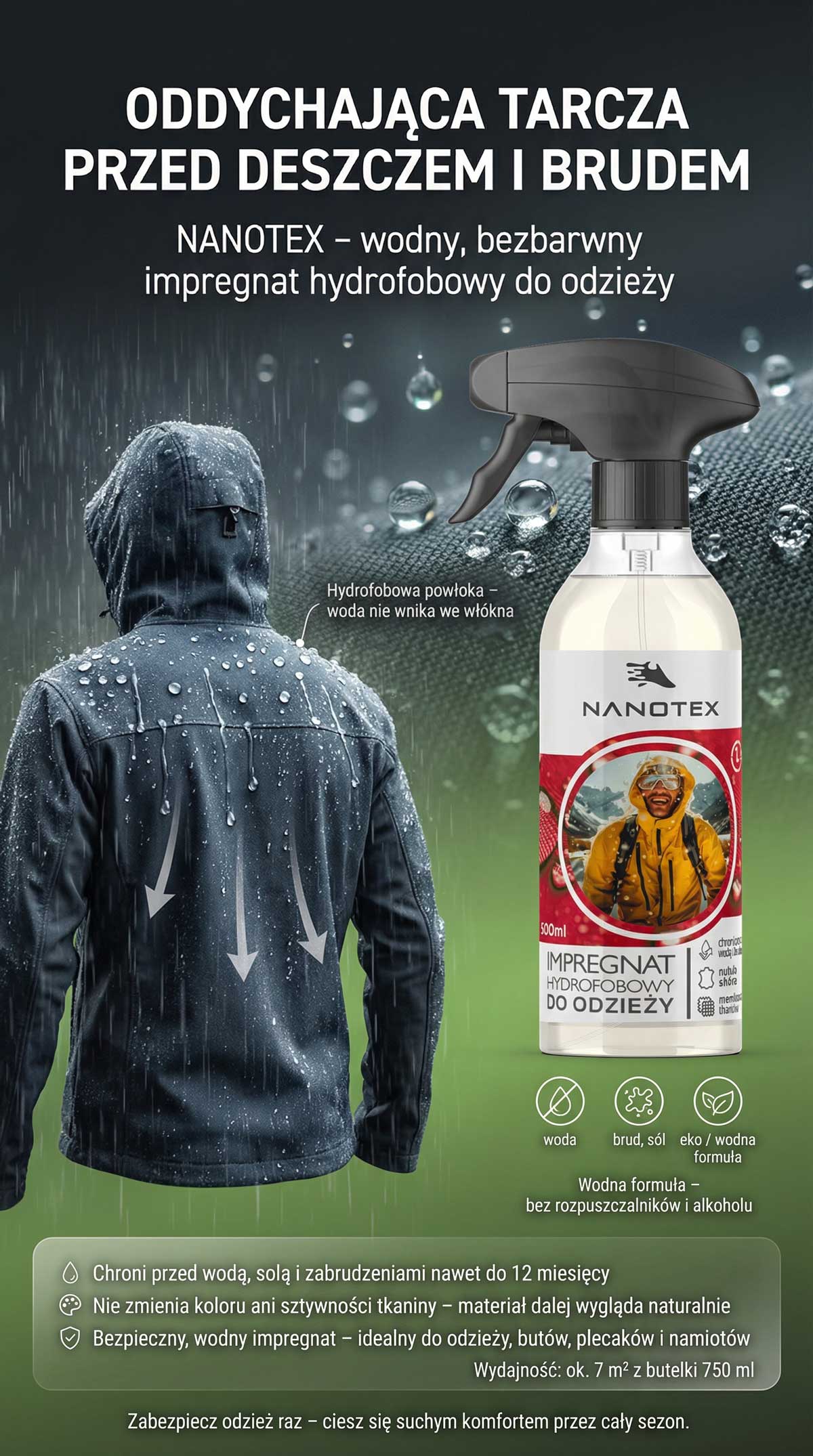 W praktyce dobra impregnacja typu NanoTex poprawia komfort oddychającej kurtki, bo utrzymuje suchy materiał zewnętrzny – a mokry, nasiąknięty materiał zawsze schładza i daje wrażenie „foliowego worka”, nawet jeśli membrana jeszcze działa.