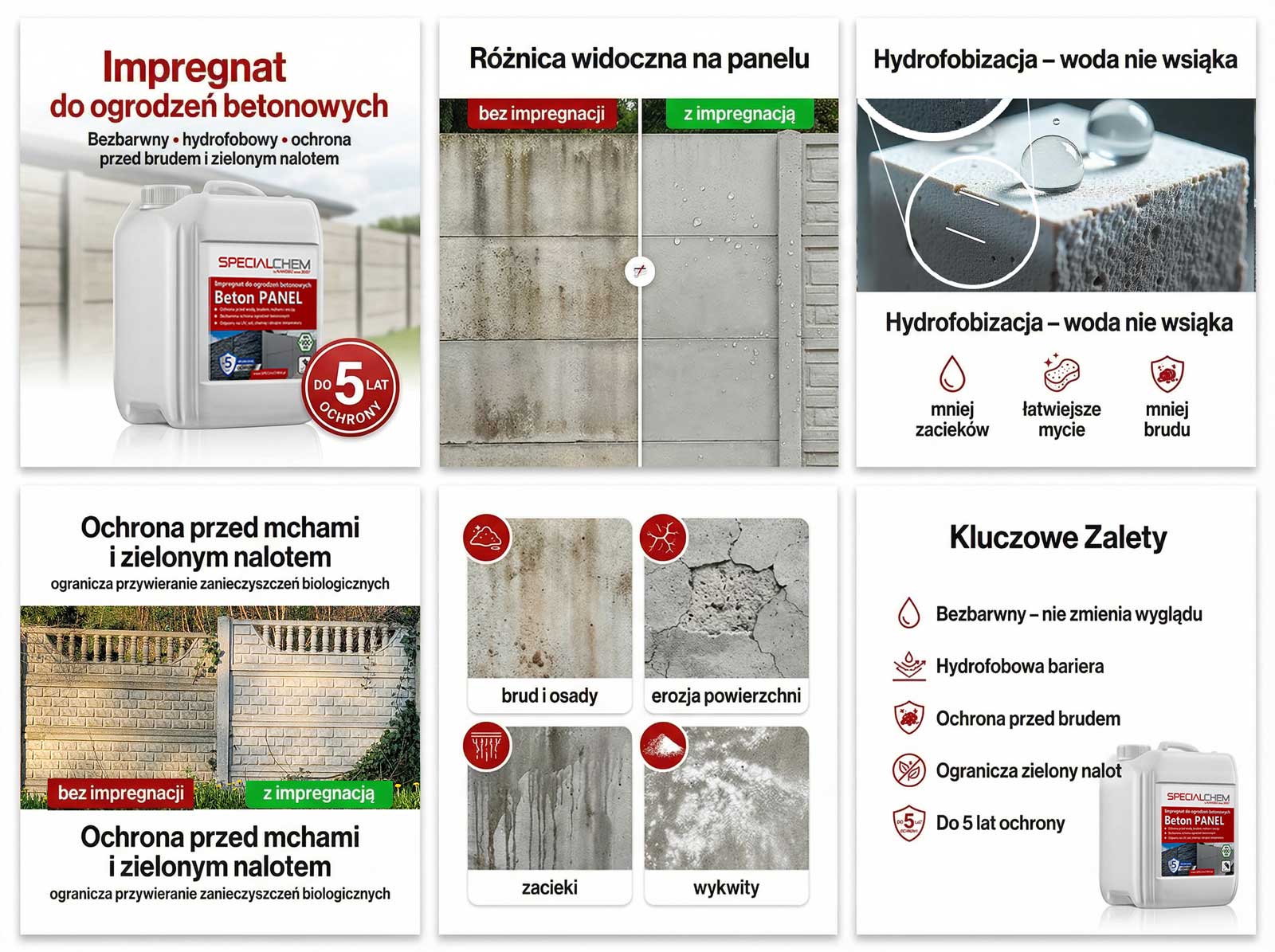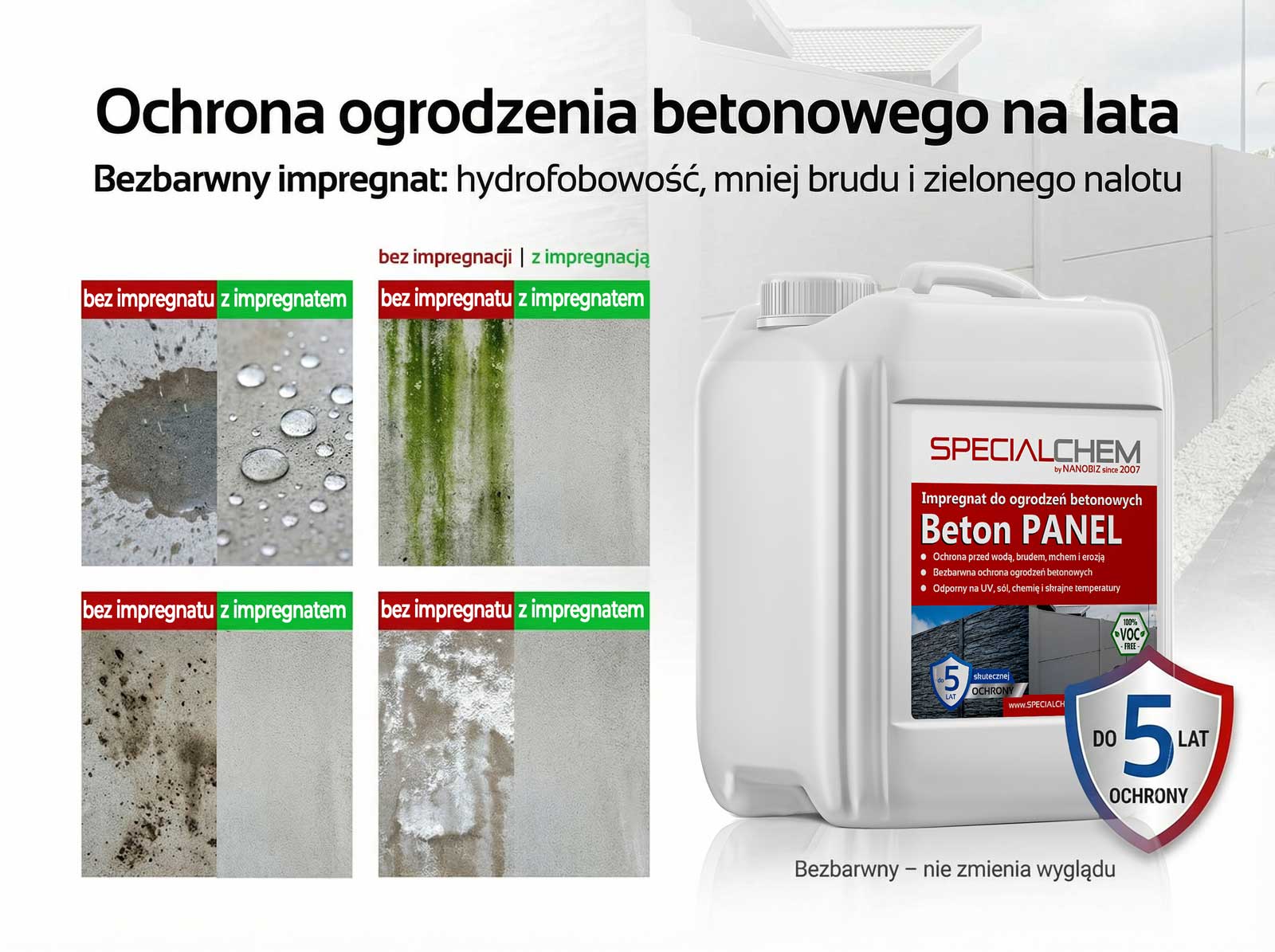 Specialchem BETON PANEL impregnat do ogrodzeń betonowych to innowacyjny, nanotechnologiczny produkt zaprojektowany do bezbarwnej ochrony ogrodzeń panelowych, palisad i betonowych. Preparat skutecznie impregnuje oraz silnie hydrofobizuje powierzchnie betonowe, co sprawia, że woda i inne zanieczyszczenia nie przenikają do wnętrza materiału. Hydrofobizacja przeciwdziała wnikaniu soli, kwaśnych deszczy i innych szkodliwych substancji, które mogą prowadzić do korozji zbrojenia, pęknięć oraz erozji. Ponadto, skutecznie zapobiega rozwojowi mchów, wykwitów solnych oraz osadzaniu się brudu.