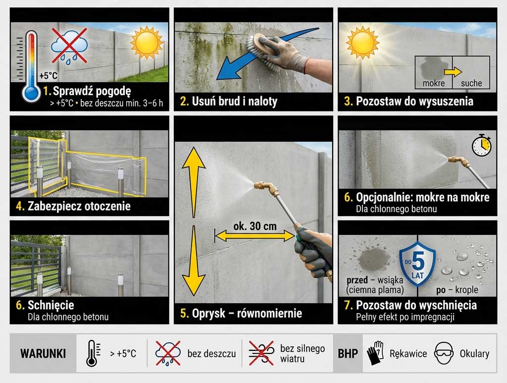 | 6. Ile warstw trzeba nałożyć? | Zwykle wystarcza jedna warstwa; przy bardzo chłonnym betonie zalecane są dwie warstwy „mokro na mokro” (drugą przed wyschnięciem pierwszej). |