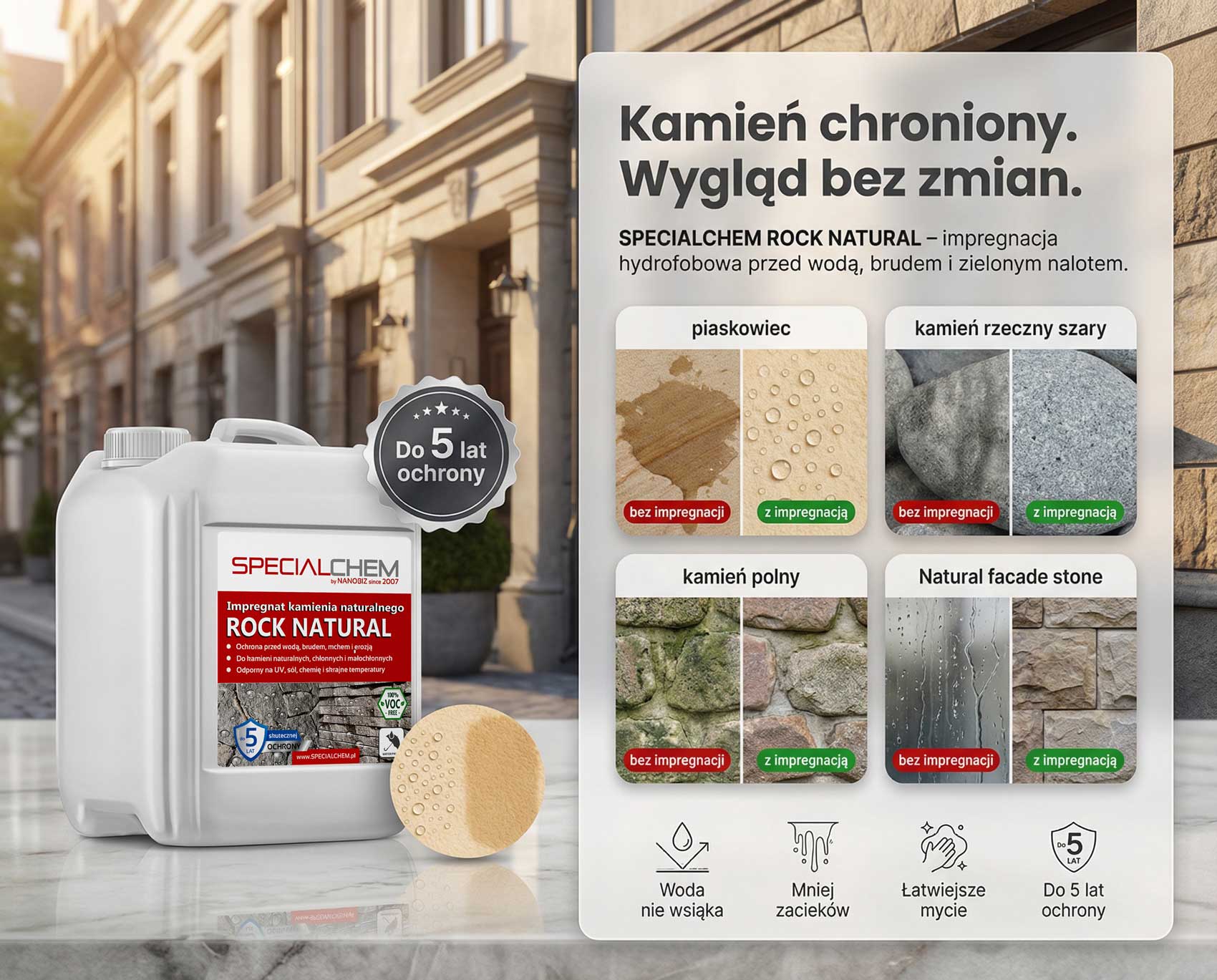 Specialchem ROCK NATURAL impregnat do kamienia naturalnego to wodny impregnat nanotechnologiczny przeznaczony do trwałej ochrony kamienia na zewnątrz i wewnątrz budynków. Preparat zabezpiecza powierzchnię przed wnikaniem wody, soli i zabrudzeń oraz ogranicza erozję i degradację pod wpływem warunków atmosferycznych. Dzięki głębokiej penetracji w strukturę podłoża ochrona jest odporna na użytkowanie nawet na posadzkach i w strefach intensywnego ruchu. Formuła roztworu wodnego nie pozostawia nieprzyjemnego zapachu i nie zawiera toksycznych rozpuszczalników. Impregnacja działa w porach kamienia, a nie jako „film” na powierzchni, co ułatwia utrzymanie czystości i redukuje przywieranie zanieczyszczeń. Jeśli szukasz rozwiązania „na lata” do kamienia naturalnego, Specialchem ROCK NATURAL impregnat do kamienia naturalnego jest celowanym wyborem do zabezpieczenia powierzchni mineralnych.