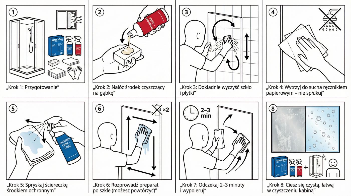 W praktyce Zestaw do kabin prysznicowych NANO-BAU shower kit + Smartblond czysty prysznic jest najskuteczniejszy, gdy po impregnacji utrzymujesz kabinę regularnie, ale łagodnie – bez agresywnych kwasów.