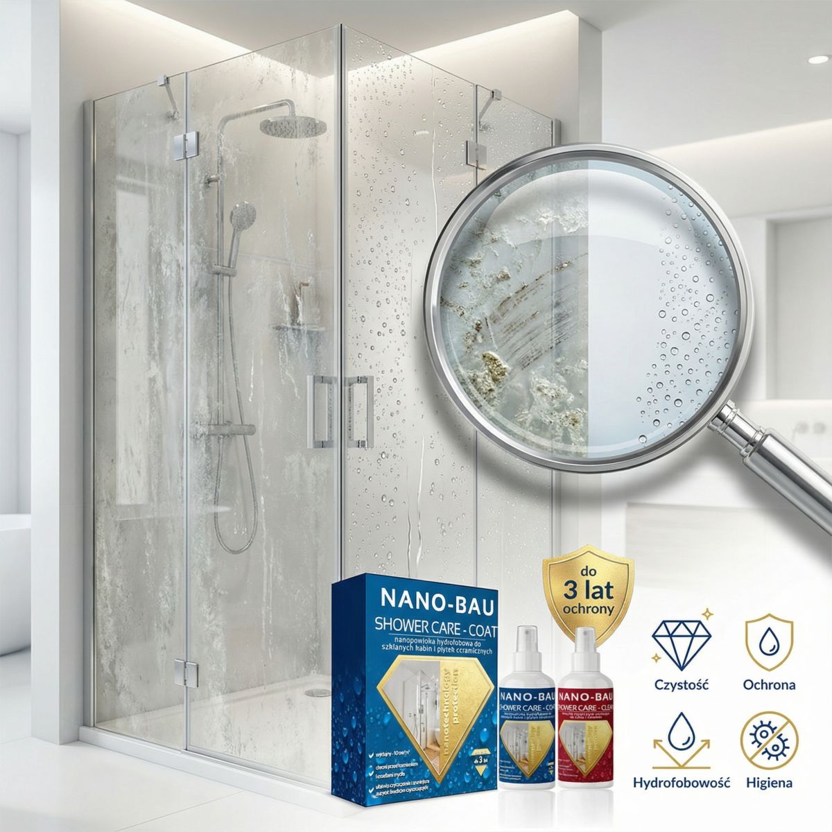 | 6) Czy naprawdę muszę używać ściągaczki po każdym prysznicu? | Impregnacja NANO-BAU SHOWER CARE – COAT znacząco zmniejsza przywieranie wody i osadów, więc „przymus” ściągaczki spada. Najlepszy standard to: impregnacja + szybkie spłukanie i 1–2 ruchy ściągaczką (opcjonalnie), zamiast pełnego mycia. | Błąd: oczekiwanie, że cokolwiek całkowicie zniesie fizykę twardej wody. Powłoka redukuje problem, ale higiena nawyków daje maksimum. |